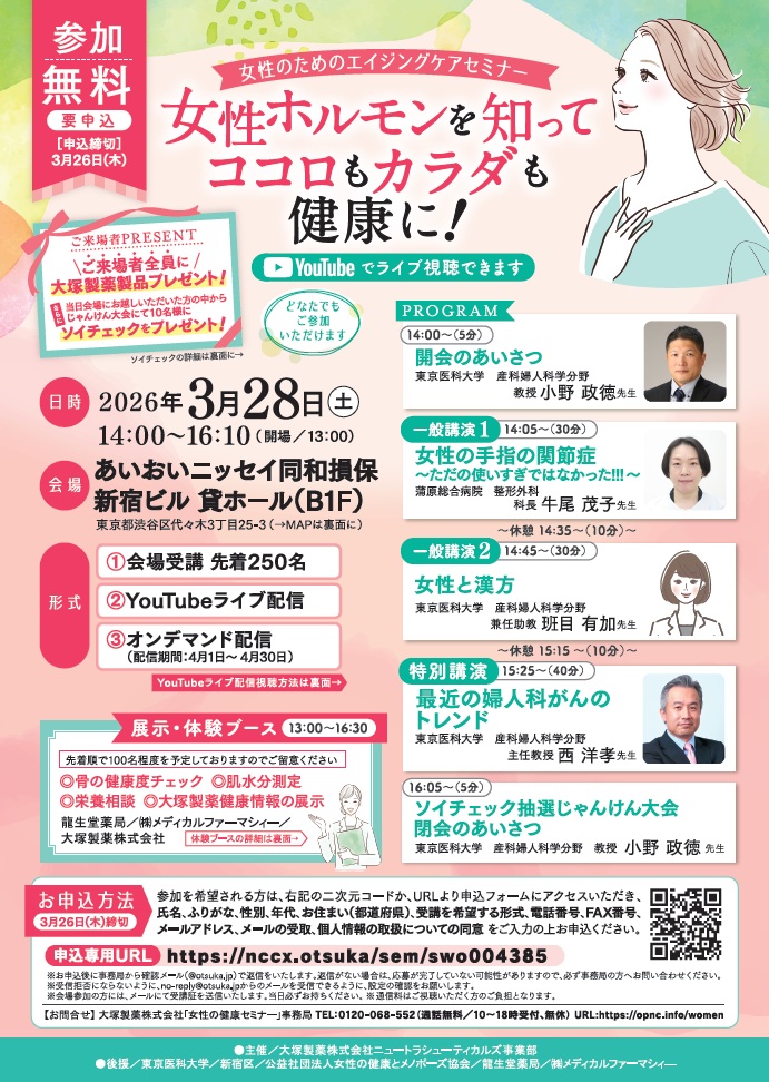 今回は、◆女性に多い手指の関節症について、◆女性特有の症状と漢方について、◆婦人科がん(子宮頸がん・子宮体がん・卵巣がん)の最新情報について、専門の先生方にご講演いただきます。